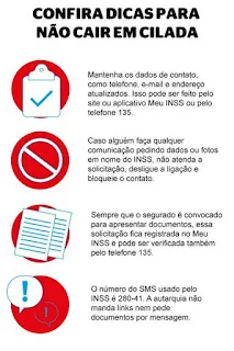 As revisões que o INSS faz em alguns benefícios também têm sido usadas por golpistas como chamariz para obter dados pessoais de beneficiários. As abordagens podem ocorrer por carta, e-mail, telefone ou mensagem de celular. Segundo o instituto, em caso de tentativa de golpe, é preciso denunciar o fato pelo site https://falabr.cgu.gov.br/ ou pela central telefônica 135.